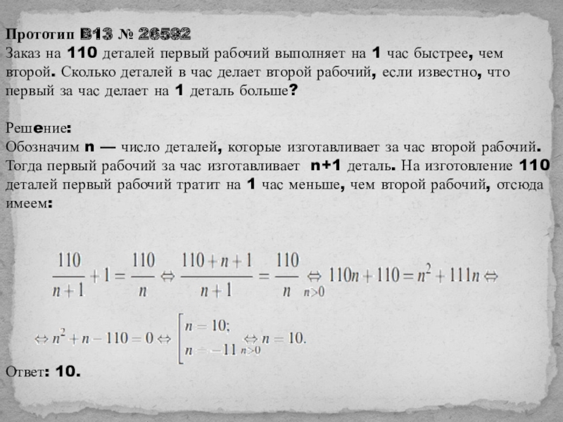 Обозначим n — число деталей, которые изготавливает за час второй рабочий. Тогда первый рабочий за час изготавливает n+1 деталь. На изготовление 110 деталей первый рабочий тратит на 1 час меньше, чем второй рабочий, отсюда имеем: