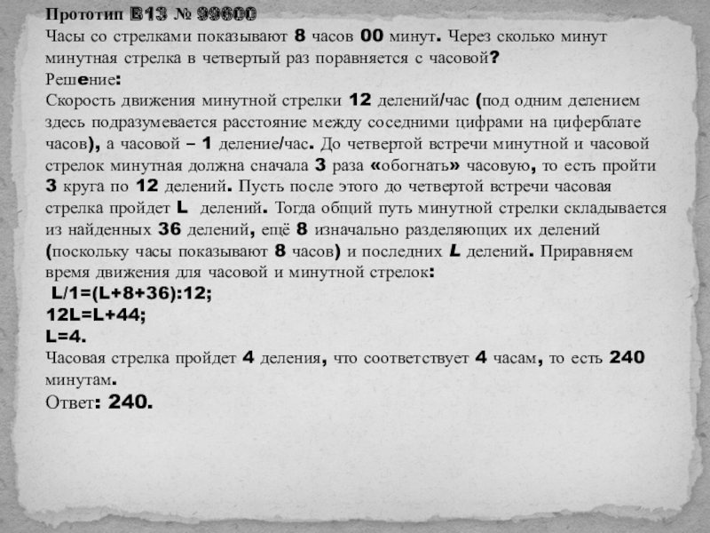 Скорость движения минутной стрелки 12 делений/час (под одним делением здесь подразумевается расстояние между соседними цифрами на циферблате часов), а часовой – 1 деление/час. До четвертой встречи минутной и часовой стрелок минутная должна сначала 3 раза «обогнать» часовую, то есть пройти 3 круга по 12 делений. Пусть после этого до четвертой встречи часовая стрелка пройдет L делений. Тогда общий путь минутной стрелки складывается из найденных 36 делений, ещё 8 изначально разделяющих их делений (поскольку часы показывают 8 часов) и последних L делений. Приравняем время движения для часовой и минутной стрелок: