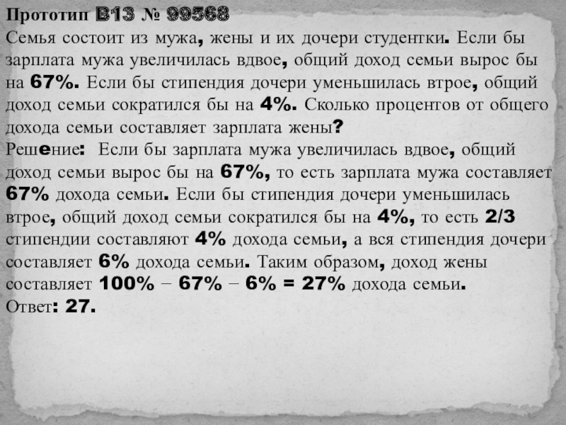 Решeние: Если бы зарплата мужа увеличилась вдвое, общий доход семьи вырос бы на 67%, то есть зарплата мужа составляет 67% дохода семьи. Если бы стипендия дочери уменьшилась втрое, общий доход семьи сократился бы на 4%, то есть 2/3 стипендии составляют 4% дохода семьи, а вся стипендия дочери составляет 6% дохода семьи. Таким образом, доход жены составляет 100% − 67% − 6% = 27% дохода семьи.
