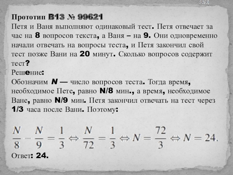 Обозначим N — число вопросов теста. Тогда время, необходимое Пете, равно N/8 мин., а время, необходимое Ване, равно N/9 мин. Петя закончил отвечать на тест через 1/3 часа после Вани. Поэтому: