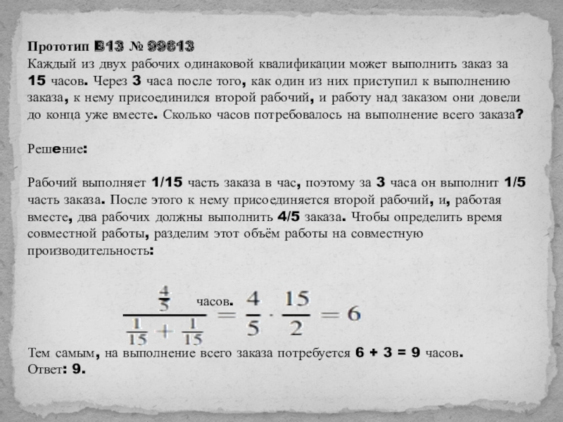 заказ за 15 часов. Через 3 часа после того, как один из них приступил к выполнению заказа, к нему присоединился второй рабочий, и работу над заказом они довели до конца уже вместе. Сколько часов потребовалось на выполнение всего заказа?