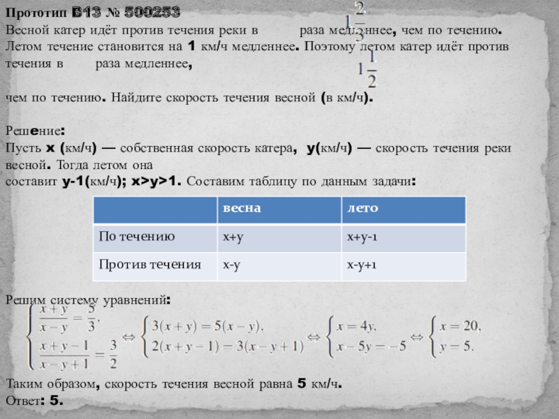 раза медленнее, чем по течению. Летом течение становится на 1 км/ч медленнее. Поэтому летом катер идёт против течения в раза медленнее,