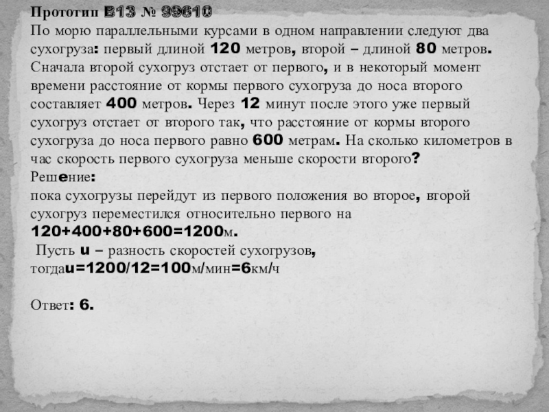 Пусть u – разность скоростей сухогрузов, тогдаu=1200/12=100м/мин=6км/ч