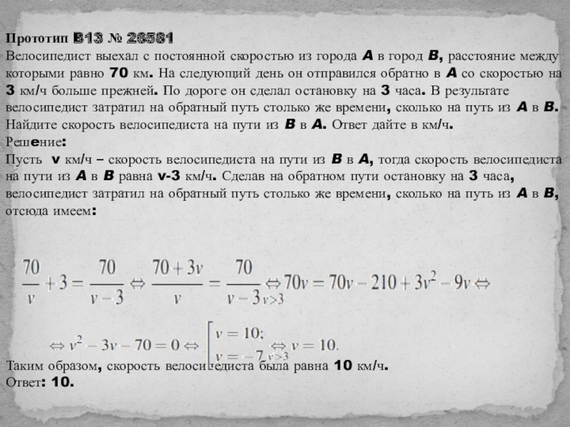 Пусть v км/ч – скорость велосипедиста на пути из B в A, тогда скорость велосипедиста на пути из A в B равна v-3 км/ч. Сделав на обратном пути остановку на 3 часа, велосипедист затратил на обратный путь столько же времени, сколько на путь из A в B, отсюда имеем: