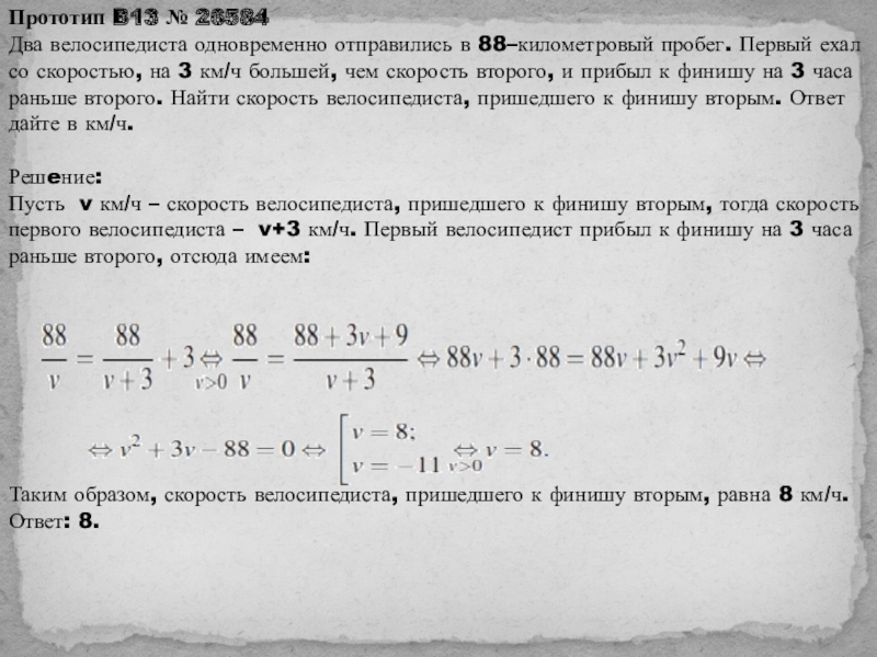 Пусть v км/ч – скорость велосипедиста, пришедшего к финишу вторым, тогда скорость первого велосипедиста – v+3 км/ч. Первый велосипедист прибыл к финишу на 3 часа раньше второго, отсюда имеем: