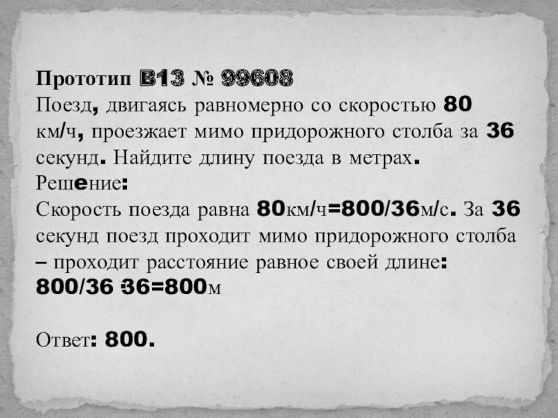 Скорость поезда равна 80км/ч=800/36м/с. За 36 секунд поезд проходит мимо придорожного столба – проходит расстояние равное своей длине: 800/36·36=800м
