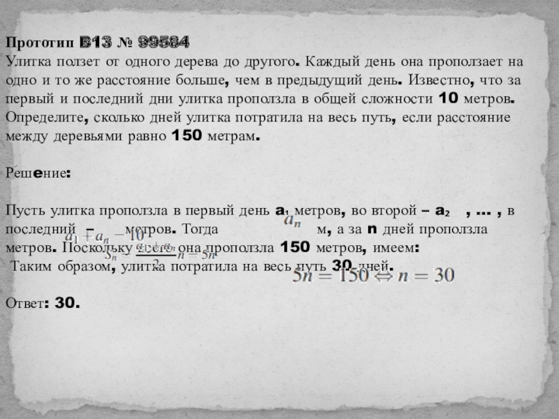 Пусть улитка проползла в первый день a₁ метров, во второй – a₂ , … , в последний – метров. Тогда м, а за n дней проползла метров. Поскольку всего она проползла 150 метров, имеем: