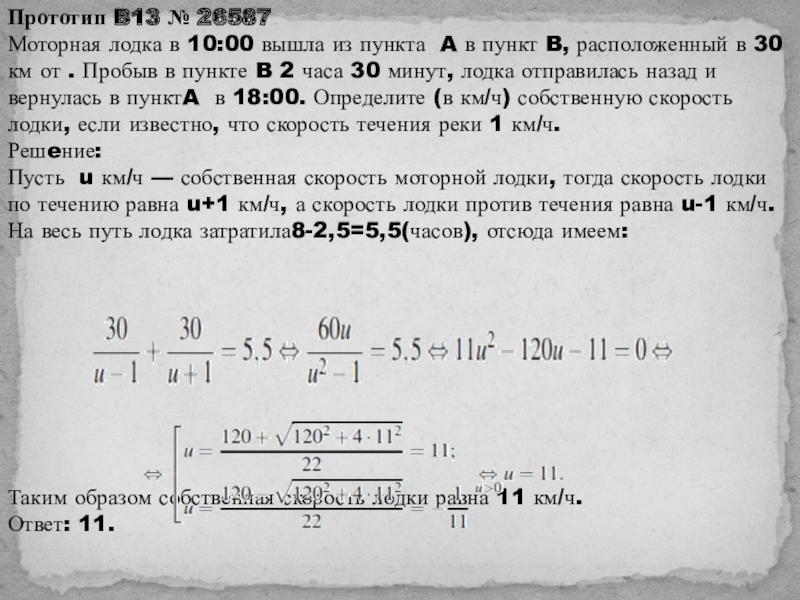 пункт B, расположенный в 30 км от . Пробыв в пункте B 2 часа 30 минут, лодка отправилась назад и вернулась в пунктA в 18:00. Определите (в км/ч) собственную скорость лодки, если известно, что скорость течения реки 1 км/ч.