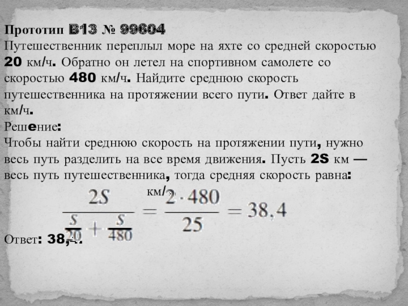 Чтобы найти среднюю скорость на протяжении пути, нужно весь путь разделить на все время движения. Пусть 2S км — весь путь путешественника, тогда средняя скорость равна: