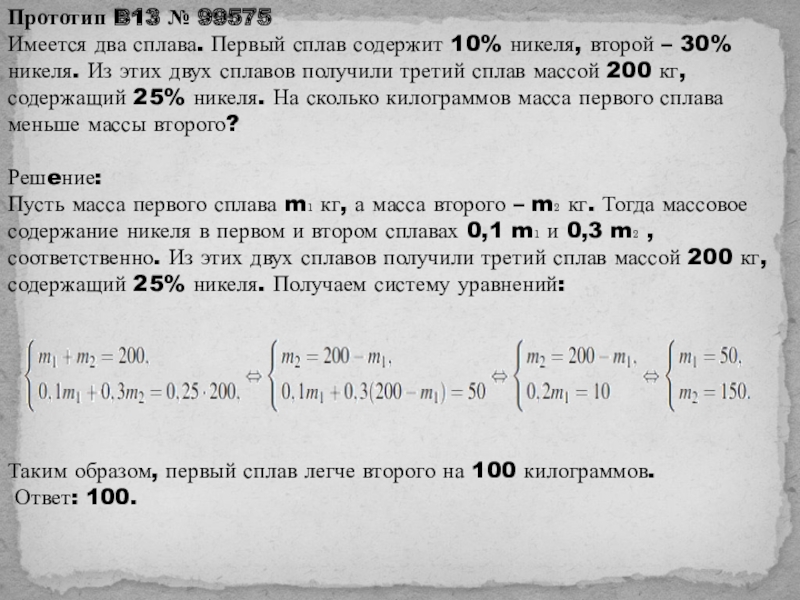 второй – 30% никеля. Из этих двух сплавов получили третий сплав массой 200 кг, содержащий 25% никеля. На сколько килограммов масса первого сплава меньше массы второго?