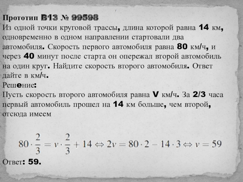 Пусть скорость второго автомобиля равна V км/ч. За 2/3 часа первый автомобиль прошел на 14 км больше, чем второй, отсюда имеем