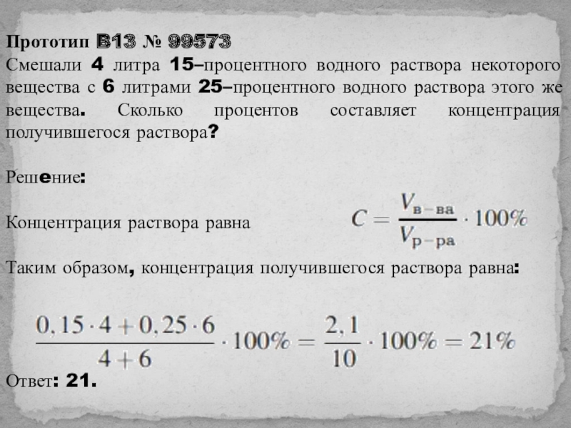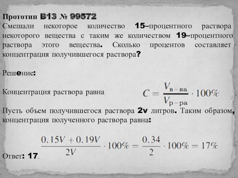 таким же количеством 19–процентного раствора этого вещества. Сколько процентов составляет концентрация получившегося раствора?