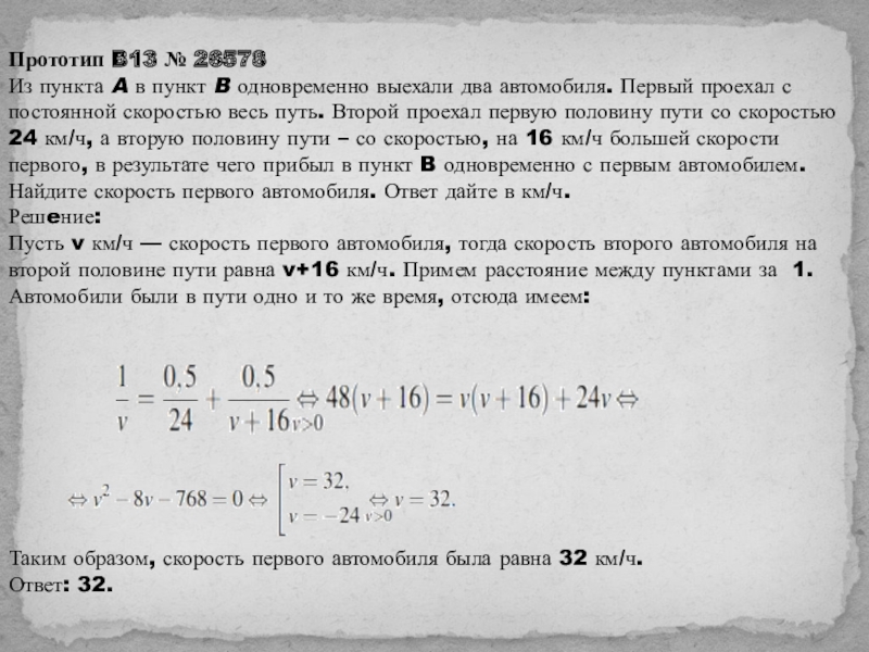 с постоянной скоростью весь путь. Второй проехал первую половину пути со скоростью 24 км/ч, а вторую половину пути – со скоростью, на 16 км/ч большей скорости первого, в результате чего прибыл в пункт B одновременно с первым автомобилем. Найдите скорость первого автомобиля. Ответ дайте в км/ч.