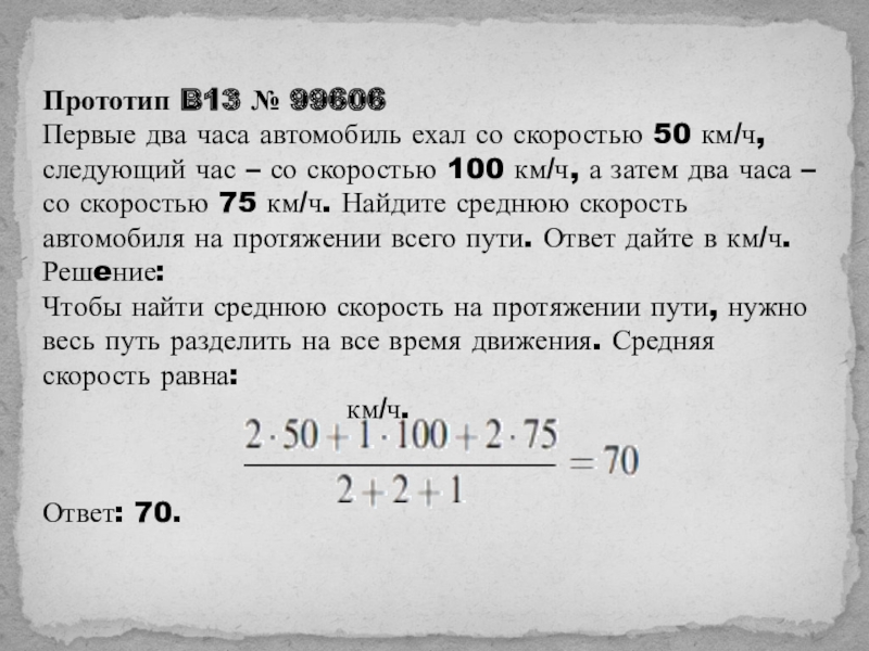 км/ч, следующий час – со скоростью 100 км/ч, а затем два часа – со скоростью 75 км/ч. Найдите среднюю скорость автомобиля на протяжении всего пути. Ответ дайте в км/ч.