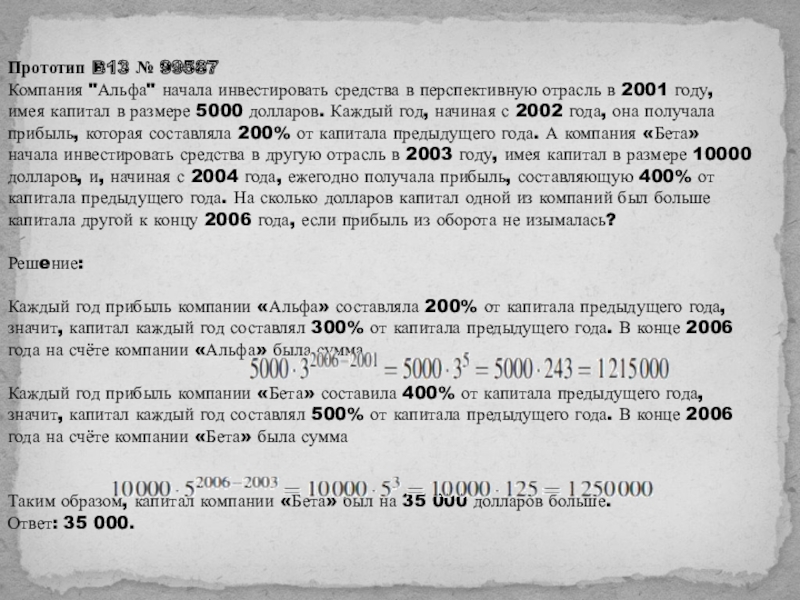 Каждый год прибыль компании «Бета» составила 400% от капитала предыдущего года, значит, капитал каждый год составлял 500% от капитала предыдущего года. В конце 2006 года на счёте компании «Бета» была сумма