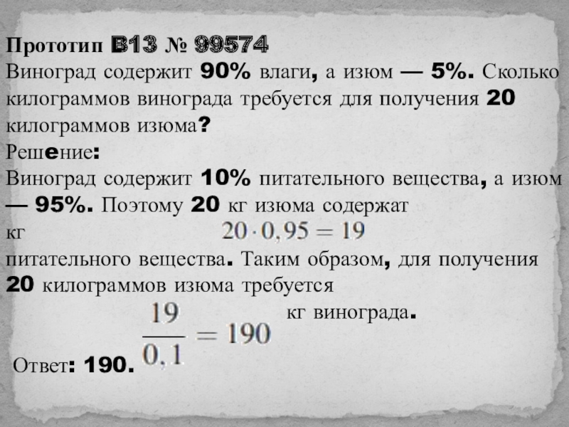 Виноград содержит 10% питательного вещества, а изюм — 95%. Поэтому 20 кг изюма содержат кг