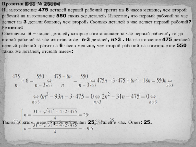 Обозначим n – число деталей, которые изготавливает за час первый рабочий, тогда второй рабочий за час изготавливает n-3 деталей, n>3 . На изготовление 475 деталей первый рабочий тратит на 6 часов меньше, чем второй рабочий на изготовление 550 таких же деталей, отсюда имеем: