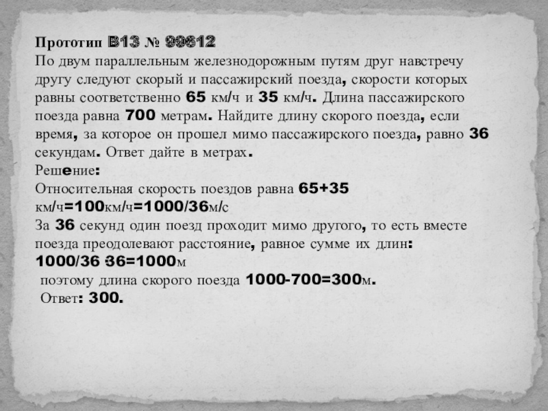 следуют скорый и пассажирский поезда, скорости которых равны соответственно 65 км/ч и 35 км/ч. Длина пассажирского поезда равна 700 метрам. Найдите длину скорого поезда, если время, за которое он прошел мимо пассажирского поезда, равно 36 секундам. Ответ дайте в метрах.