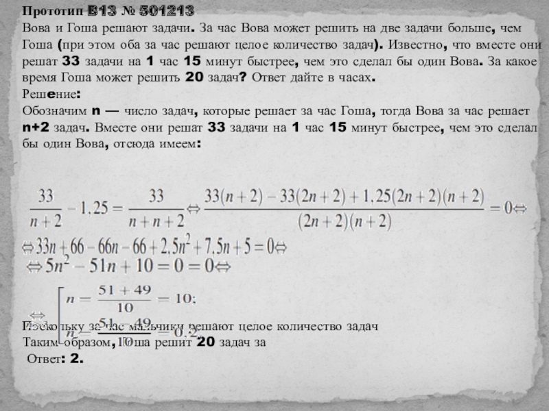 Обозначим n — число задач, которые решает за час Гоша, тогда Вова за час решает n+2 задач. Вместе они решат 33 задачи на 1 час 15 минут быстрее, чем это сделал бы один Вова, отсюда имеем:
