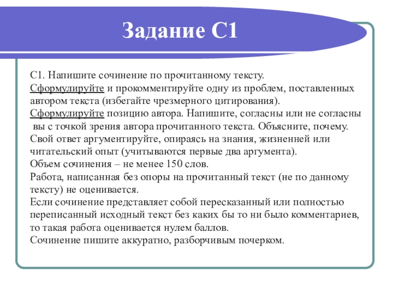 Часть С: сочинение-рассуждение по заданному тексту. Объем не менее 150 слов. 23 баллов.