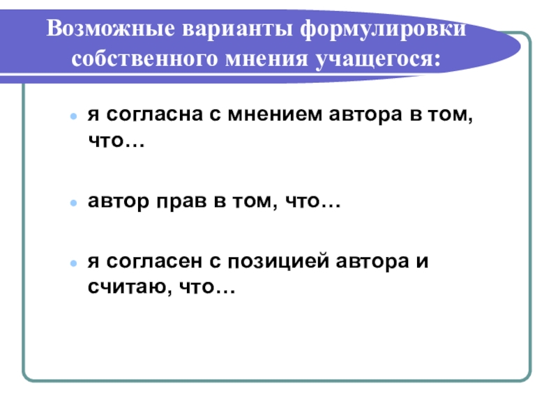 Слайд 14Возможные варианты формулировки собственного мнения учащегося: