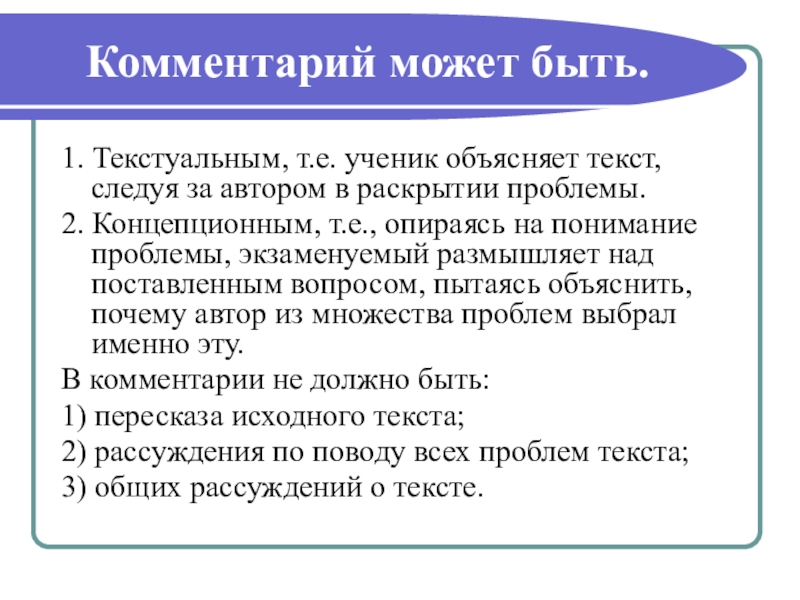 2. Концепционным, т.е., опираясь на понимание проблемы, экзаменуемый размышляет над поставленным вопросом, пытаясь объяснить, почему автор из множества проблем выбрал именно эту.