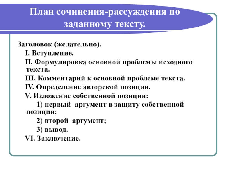 Слайд 5План сочинения-рассуждения по заданному тексту.