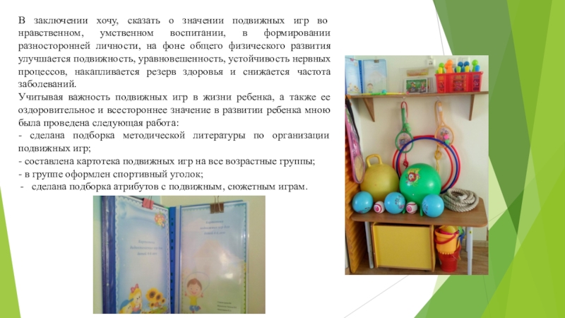Учитывая важность подвижных игр в жизни ребенка, а также ее оздоровительное и всестороннее значение в развитии ребенка мною была проведена следующая работа:
