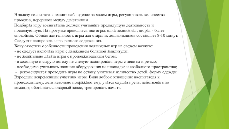 Подбирая игру воспитатель должен учитывать предыдущую деятельность и последующую. На прогулке проводится две игры: одна подвижная, вторая - более спокойная. Общая длительность игры для старших дошкольников составляет 8-10 минут. Следует планировать игры разного содержания.