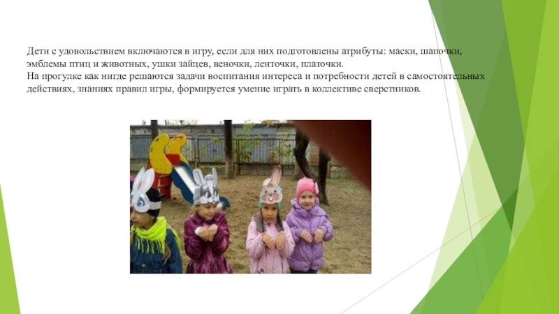 На прогулке как нигде решаются задачи воспитания интереса и потребности детей в самостоятельных действиях, знаниях правил игры, формируется умение играть в коллективе сверстников.