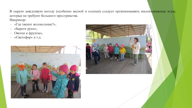 - в холодную и сырую погоду не следует планировать игры с пением и речью;