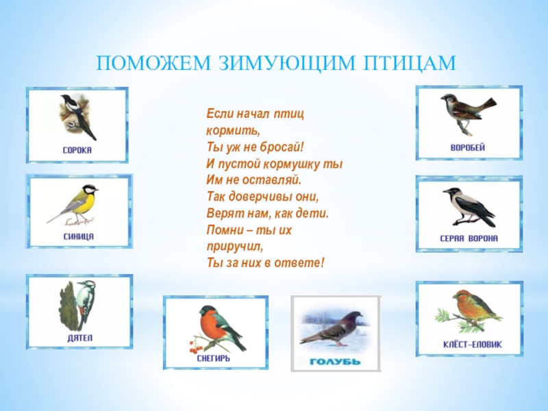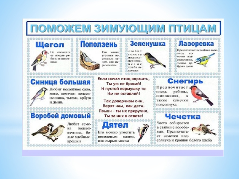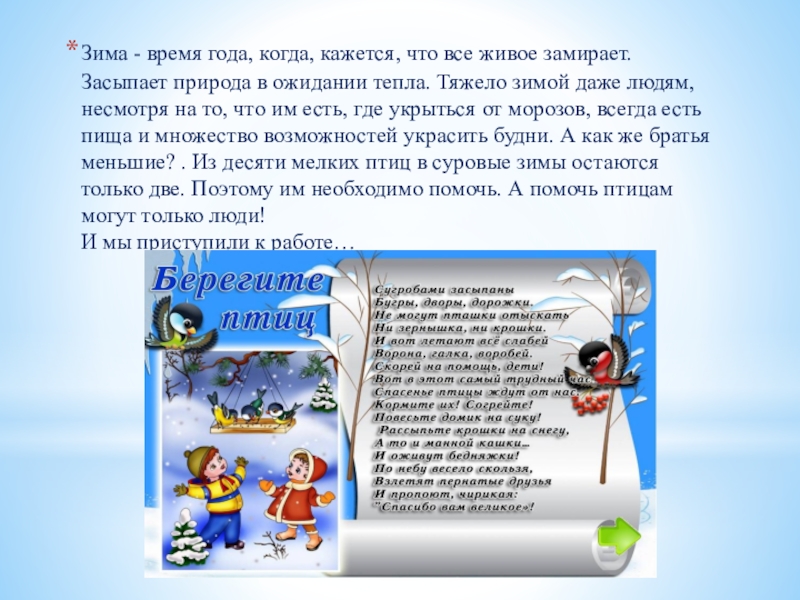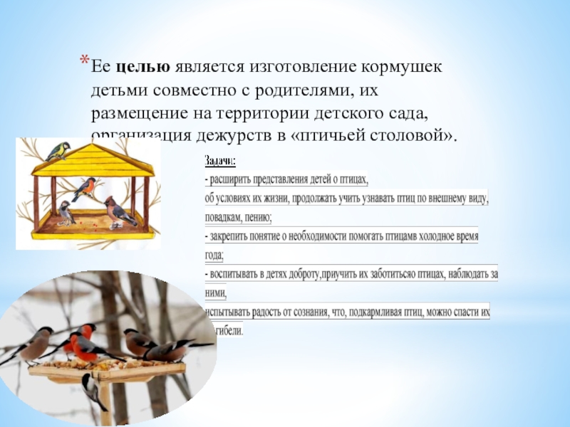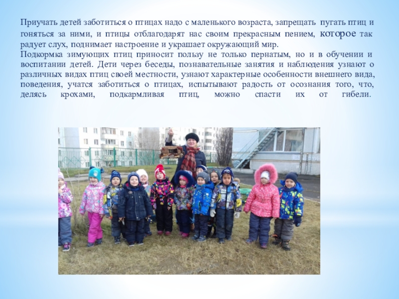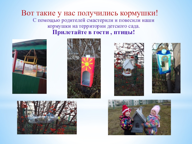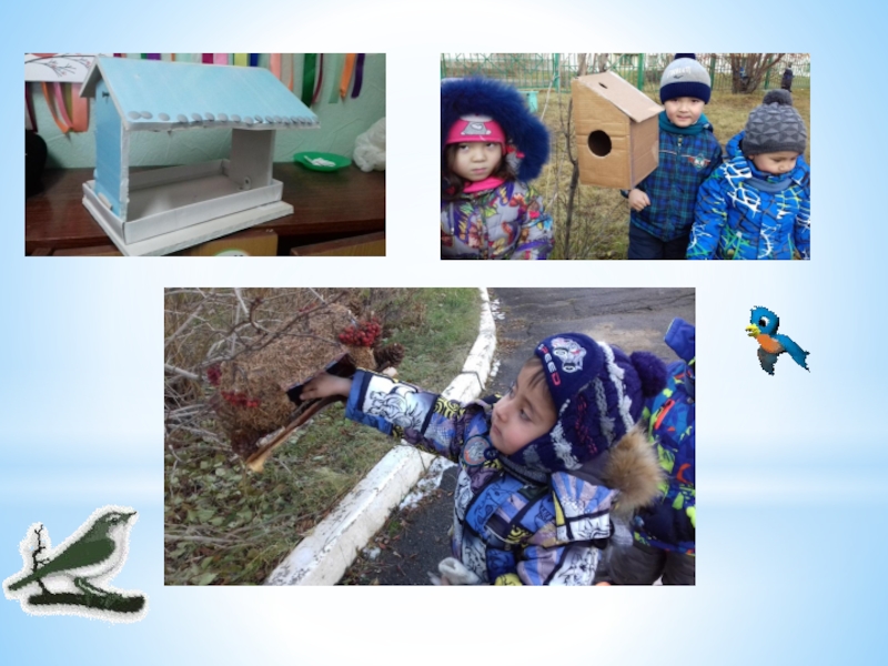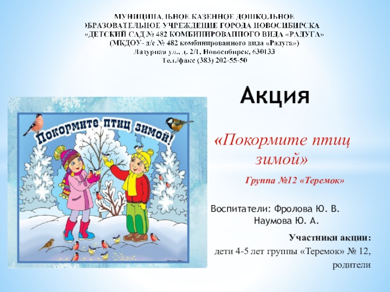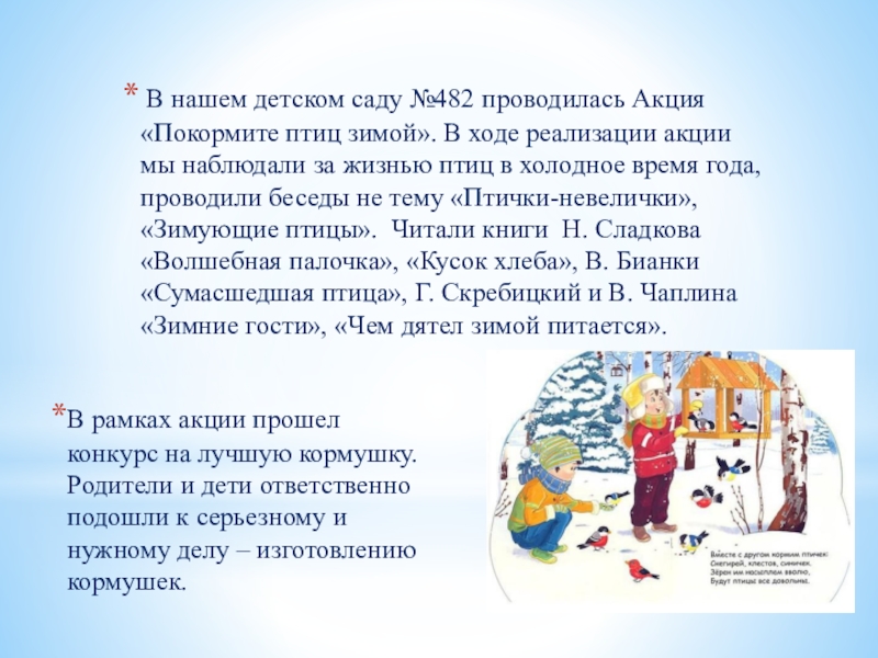 В нашем детском саду №482 проводилась Акция «Покормите птиц зимой». В ходе реализации акции мы наблюдали за жизнью птиц в холодное время года, проводили беседы не тему «Птички-невелички», «Зимующие птицы». Читали книги Н. Сладкова «Волшебная палочка», «Кусок хлеба», В. Бианки «Сумасшедшая птица», Г. Скребицкий и В. Чаплина «Зимние гости», «Чем дятел зимой питается».