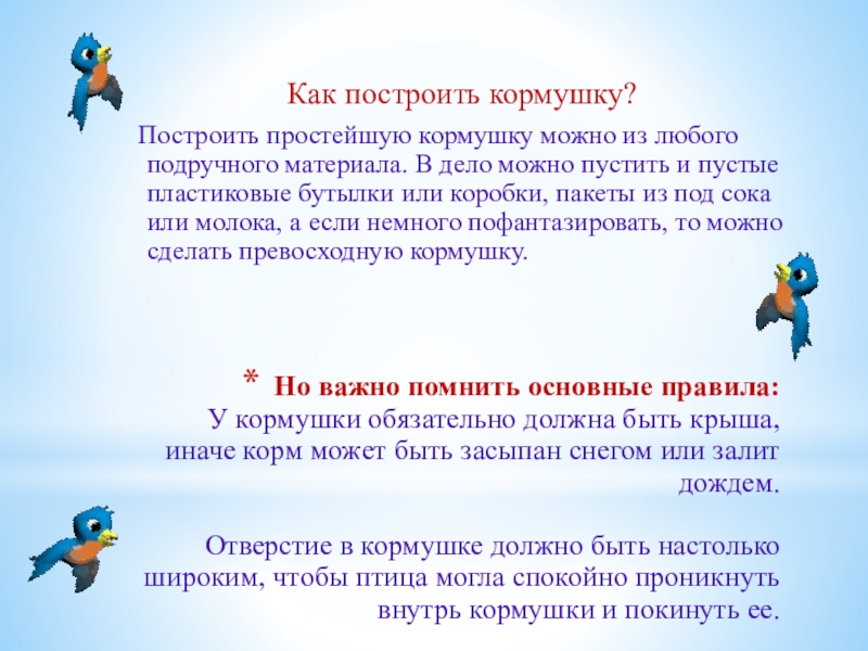 Построить простейшую кормушку можно из любого подручного материала. В дело можно пустить и пустые пластиковые бутылки или коробки, пакеты из под сока или молока, а если немного пофантазировать, то можно сделать превосходную кормушку.