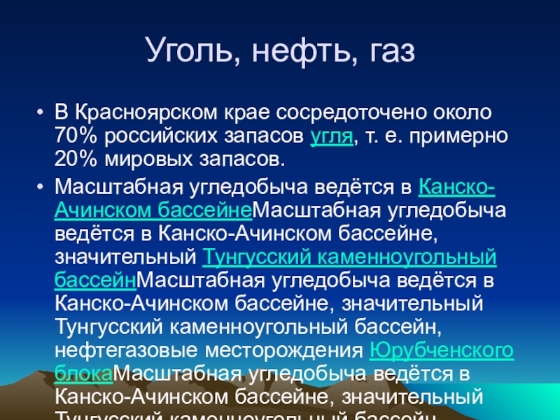 Масштабная угледобыча ведётся в Канско-Ачинском бассейнеМасштабная угледобыча ведётся в Канско-Ачинском бассейне, значительный Тунгусский каменноугольный бассейнМасштабная угледобыча ведётся в Канско-Ачинском бассейне, значительный Тунгусский каменноугольный бассейн, нефтегазовые месторождения Юрубченского блокаМасштабная угледобыча ведётся в Канско-Ачинском бассейне, значительный Тунгусский каменноугольный бассейн, нефтегазовые месторождения Юрубченского блока, крупное Ванкорское нефтегазовое месторождение.