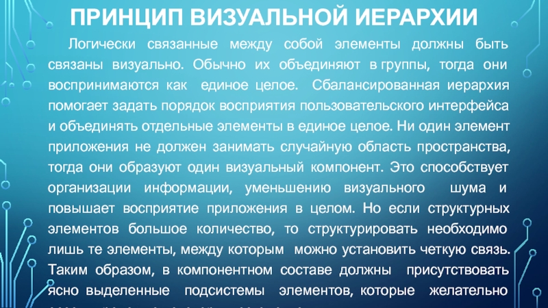 Обычно их объединяют в группы, тогда они воспринимаются как единое целое. Сбалансированная иерархия помогает задать порядок восприятия пользовательского интерфейса и объединять отдельные элементы в единое целое. Ни один элемент приложения не должен занимать случайную область пространства, тогда они образуют один визуальный компонент. Это способствует организации информации, уменьшению визуального шума и повышает восприятие приложения в целом. Но если структурных элементов большое количество, то структурировать необходимо лишь те элементы, между которым можно установить четкую связь. Таким образом, в компонентном составе должны присутствовать ясно выделенные подсистемы элементов, которые желательно ассоциировать с некоторым заголовком.