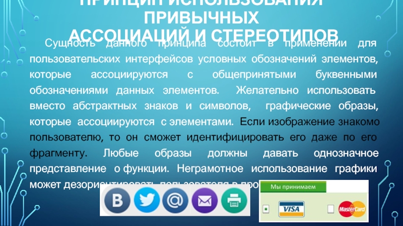 пользовательских интерфейсов условных обозначений элементов, которые ассоциируются с общепринятыми буквенными обозначениями данных элементов. Желательно использовать вместо абстрактных знаков и символов, графические образы, которые ассоциируются с элементами. Если изображение знакомо пользователю, то он сможет идентифицировать его даже по его фрагменту. Любые образы должны давать однозначное представление о функции. Неграмотное использование графики может дезориентировать пользователя в программе.