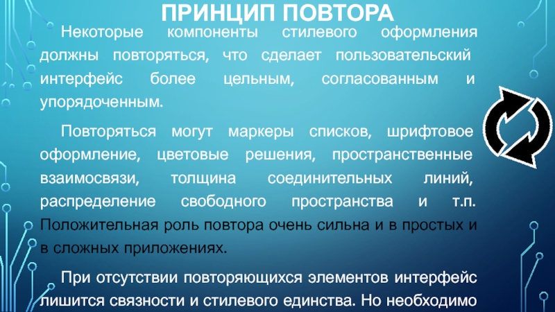 Повторяться могут маркеры списков, шрифтовое оформление, цветовые решения, пространственные взаимосвязи, толщина соединительных линий, распределение свободного пространства и т.п. Положительная роль повтора очень сильна и в простых и в сложных приложениях.