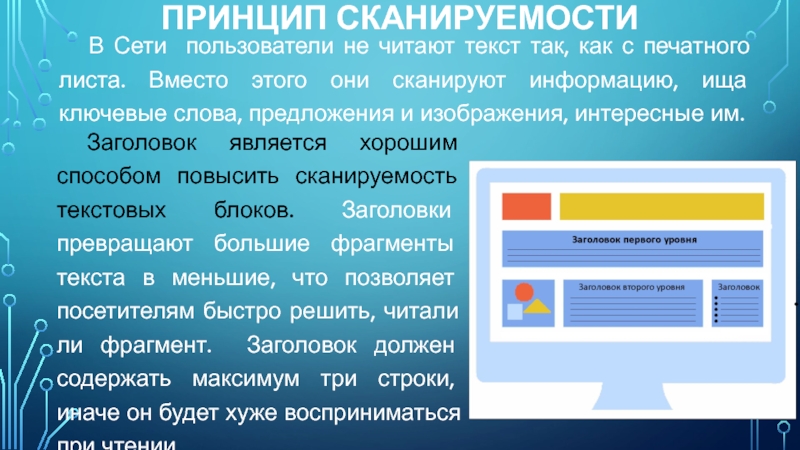 печатного листа. Вместо этого они сканируют информацию, ища ключевые слова, предложения и изображения, интересные им.