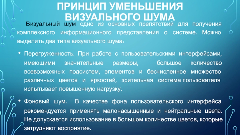 Фоновый шум. В качестве фона пользовательского интерфейса рекомендуется применять малонасыщенные и нейтральные цвета. Не допускается использование в большом количестве цветов, которые затрудняют восприятие.