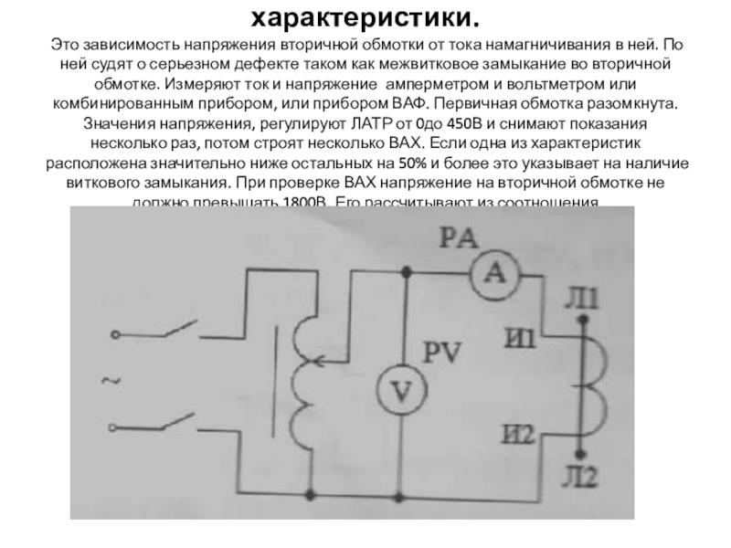 от тока намагничивания в ней. По ней судят о серьезном дефекте таком как межвитковое замыкание во вторичной обмотке. Измеряют ток и напряжение амперметром и вольтметром или комбинированным прибором, или прибором ВАФ. Первичная обмотка разомкнута. Значения напряжения, регулируют ЛАТР от 0до 450В и снимают показания несколько раз, потом строят несколько ВАХ. Если одна из характеристик расположена значительно ниже остальных на 50% и более это указывает на наличие виткового замыкания. При проверке ВАХ напряжение на вторичной обмотке не должно превышать 1800В. Его рассчитывают из соотношения