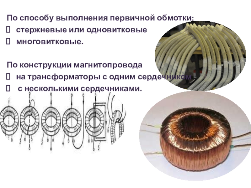3. По конструкции первичной обмотки - стержневые - одновитковые; катушечные - многовитковые.
