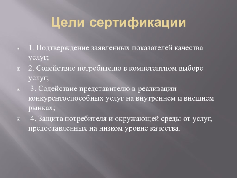 Цели сертификации1. Подтверждение заявленных показателей качества услуг; 2. Содействие потребителю в компетентном выборе услуг; 3. Содействие представителю
