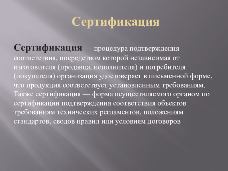 (продавца, исполнителя) и потребителя (покупателя) организация удостоверяет в письменной форме, что продукция соответствует установленным требованиям. Также сертификация — форма осуществляемого органом по сертификации подтверждения соответствия объектов требованиям технических регламентов, положениям стандартов, сводов правил или условиям договоров
