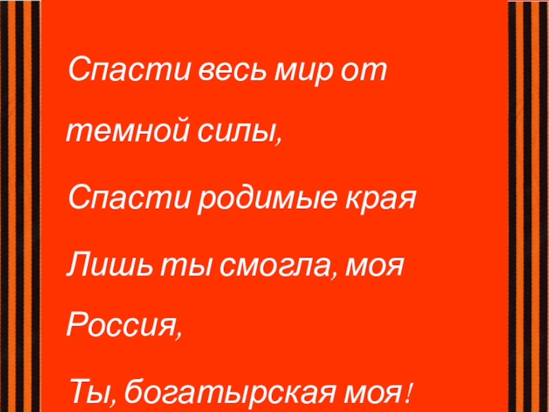 Спасти весь мир от темной силы,Спасти родимые краяЛишь ты смогла, моя Россия,Ты, богатырская моя!