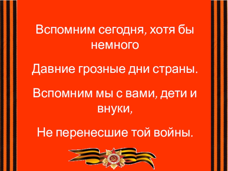 Вспомним сегодня, хотя бы немногоДавние грозные дни страны.Вспомним мы с вами, дети и внуки,Не перенесшие той войны.