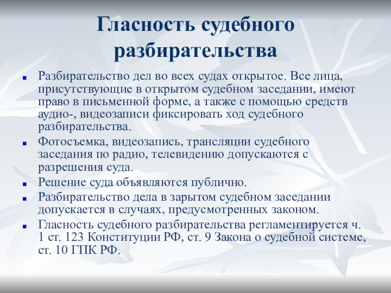 Гласность судебного разбирательства регламентируется ч. 1 ст. 123 Конституции РФ, ст. 9 Закона о судебной системе, ст. 10 ГПК РФ.