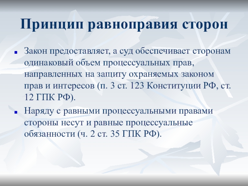 Закон предоставляет, а суд обеспечивает сторонам одинаковый объем процессуальных