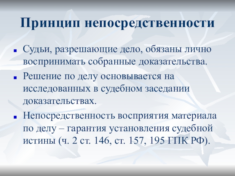 Непосредственность восприятия материала по делу – гарантия установления судебной истины (ч. 2 ст. 146, ст. 157, 195 ГПК РФ).