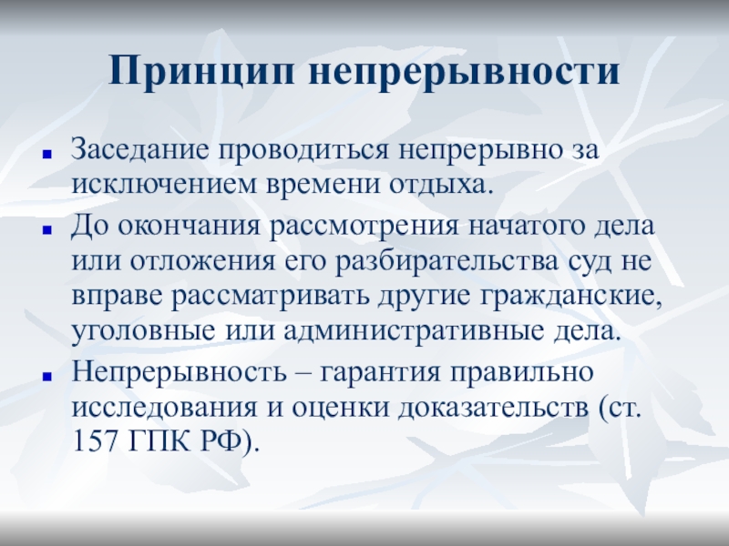 Непрерывность – гарантия правильно исследования и оценки доказательств (ст. 157 ГПК РФ).