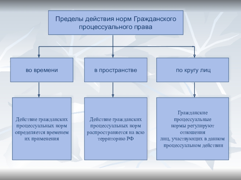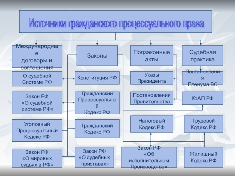 право – совокупность правовых норм, регулирующих общественные отношения, возникающие в процессе рассмотрения и разрешения судом общей юрисдикции гражданских дел, семейных, трудовых и иных споров, подведомственных данному суду.